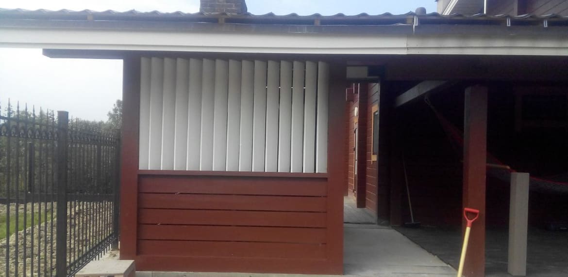 Беседка построена на солнечной стороне участка имеет качественную печь (мангал) и оборудована поворотными жалюзи для оптимизации потока света и тени для создания наиболее комфортных условий пребывания.